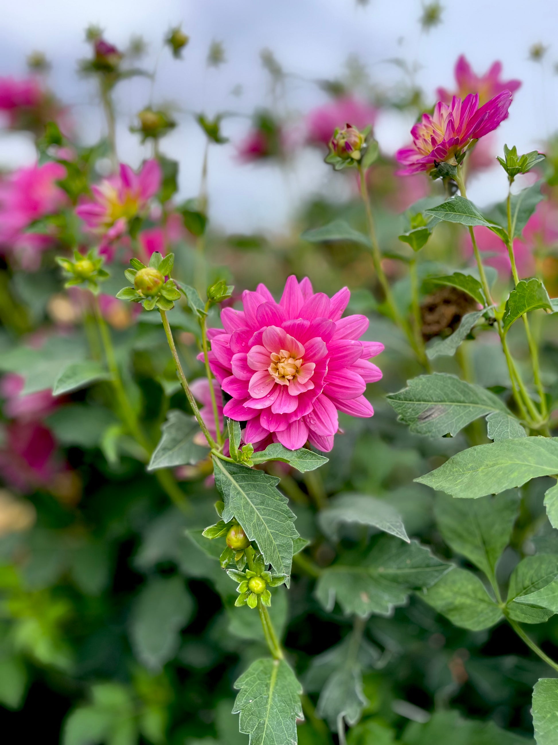 This waterlily dahlia brings me so much joy in the garden and pumps out the blooms! The blooms are 4-6 inches in size and are a vibrant pink with cream center. The plant stands 4-5 feet. The tubers are long and skinny, but have been verified.