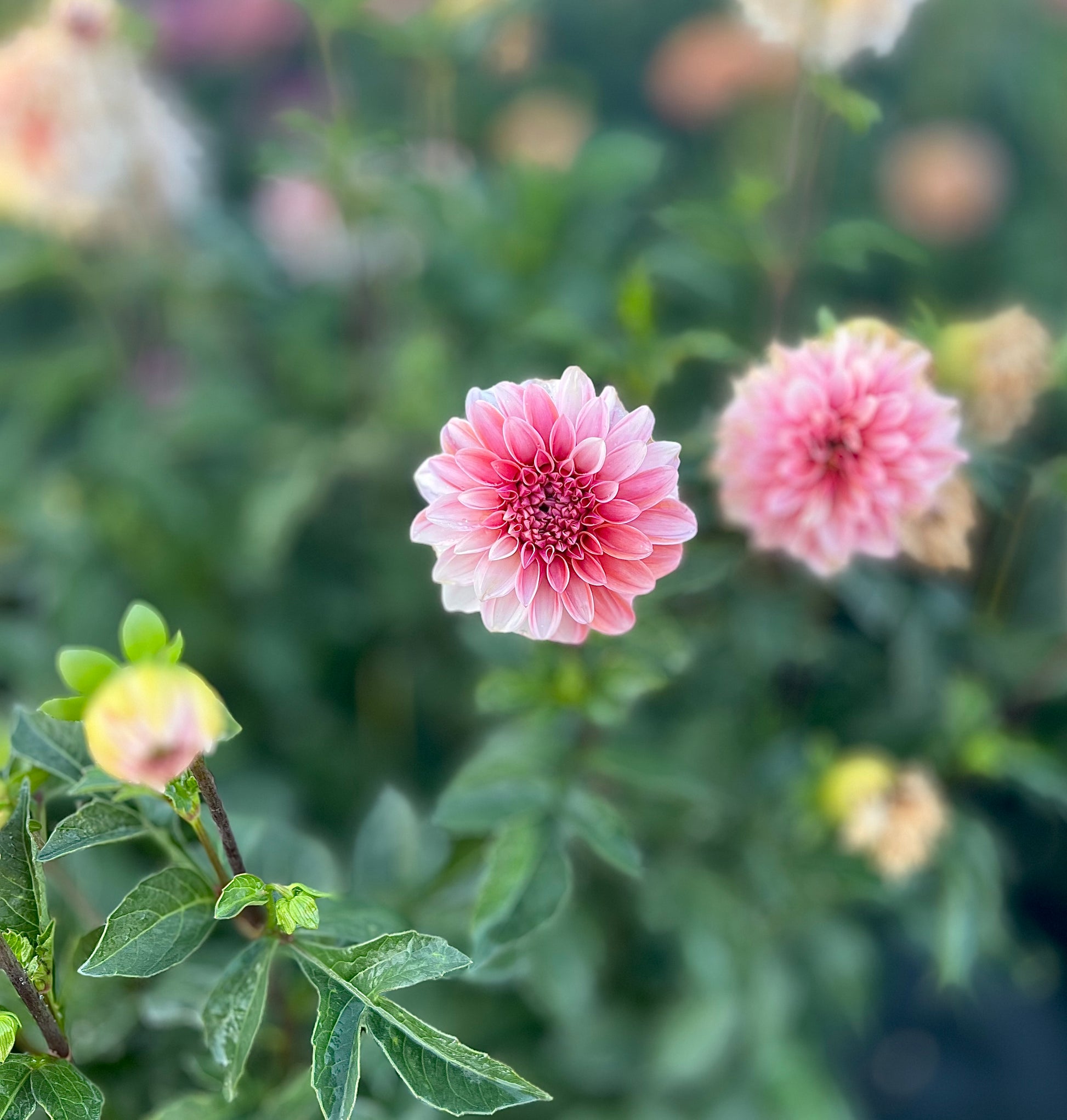 This is a miniature informal decorative dahlia that stands 3-4 feet tall. Blooms can vary in color, but are often a soft pink. This photo was taken late in the season as the cooler temperatures set in and features a darker coral pink splashed in with the softer pink. It was an early bloomer for me and produced blooms 3-4 inches in size.