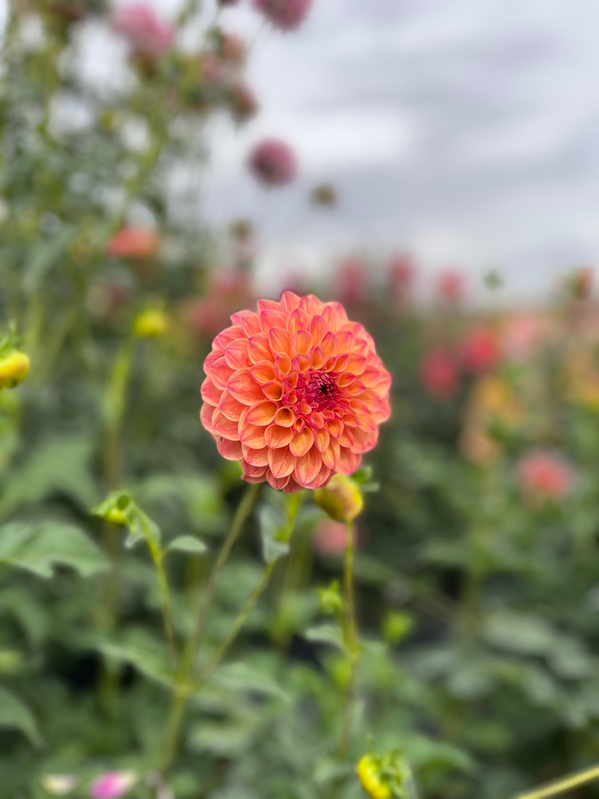 This is a ball dahlia with sunset colored blooms that are 3.5-4 inches in size. The plant is 3.5-4 feet tall and produces round, bulbous tubers.
